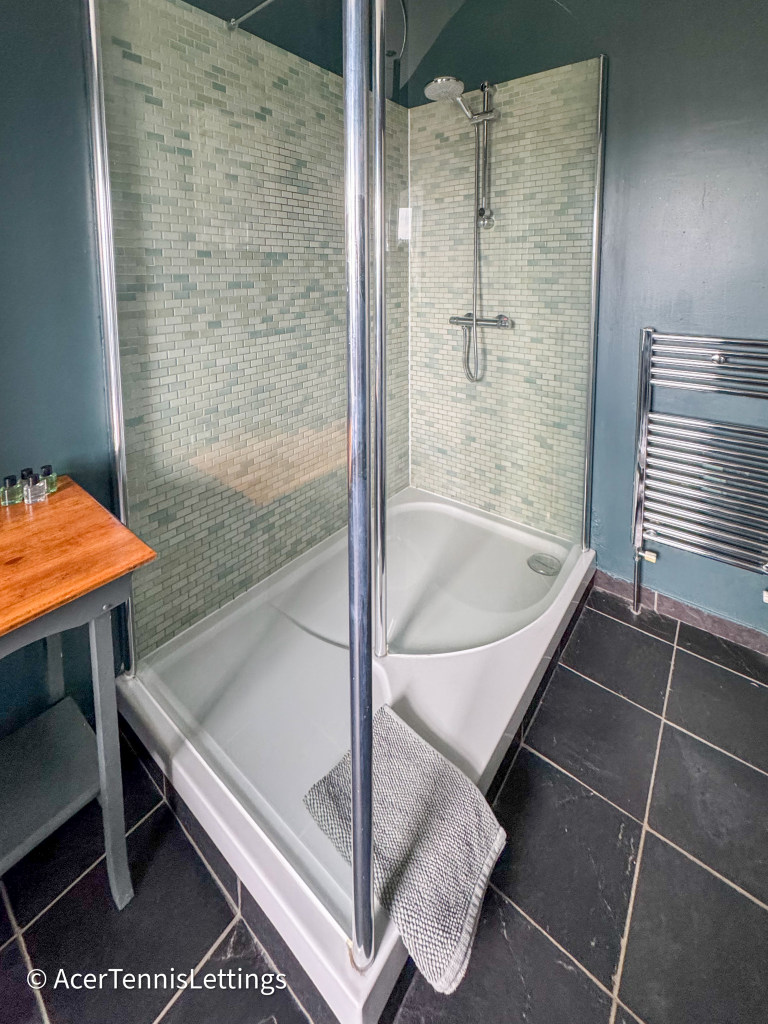 On the second floor is a very large bedroom with a double bed and French doors opening onto a juliette balcony. The ensuite bathroom has a walk in shower, basin and WC.