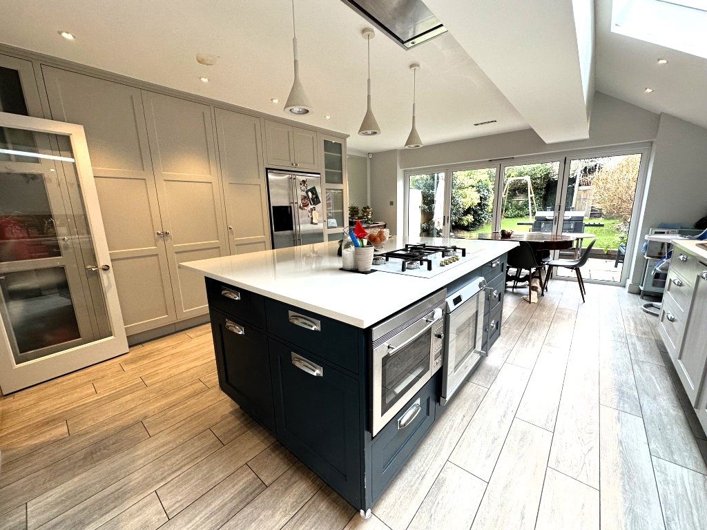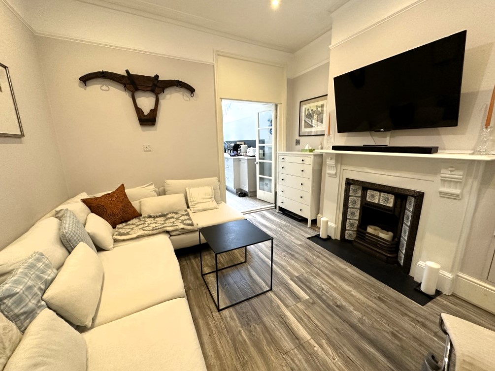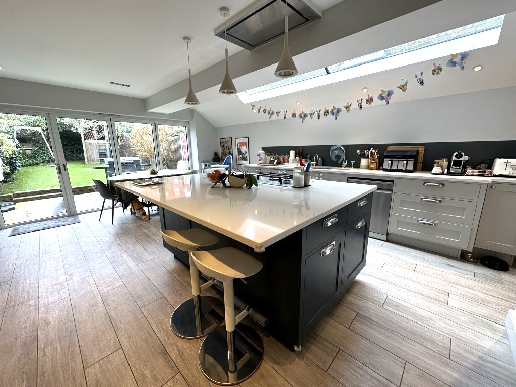 Ground floor: off the large hallway is an elegant sitting room with a large sofa and chairs . At the rear of the house is the very generous open plan kitchen dining room. The kitchen is modern and fitted with all the expected high spec appliances. There are seats at the island or the dining table seats 6 people. Glass doors open onto the garden with a BBQ and al fresco dining table for 6. There is a second sitting room with sofas and a large TV with Netflix, Disney, Virgin Media with Formula 1 and Amazon Prime. There is a downstairs WC.