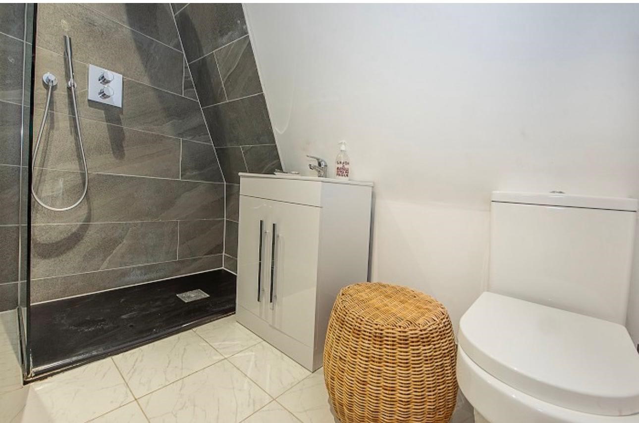 Second floor: the principal suite has a bedroom with a kingsize bed and an ensuite bathroom with a walk in shower, basin and WC. Bedroom 2 has a small double bed.