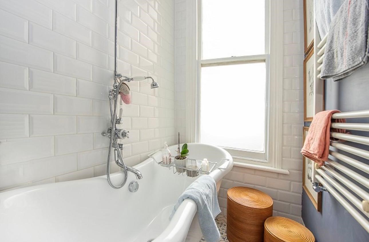 First floor: a flight of stairs leads up to the private front door. On this first floor, the sitting room and kitchen / diner both lead of the hallway. The sitting room is large with high ceilings and has a sofa, chair and a Smart TV with terrestrial channels. The kitchen is light and modern with all the expected appliances. The dining table seats up to 4 people. Also off the hallway is a bathroom with a freestanding bath with overhead shower, basin and WC.