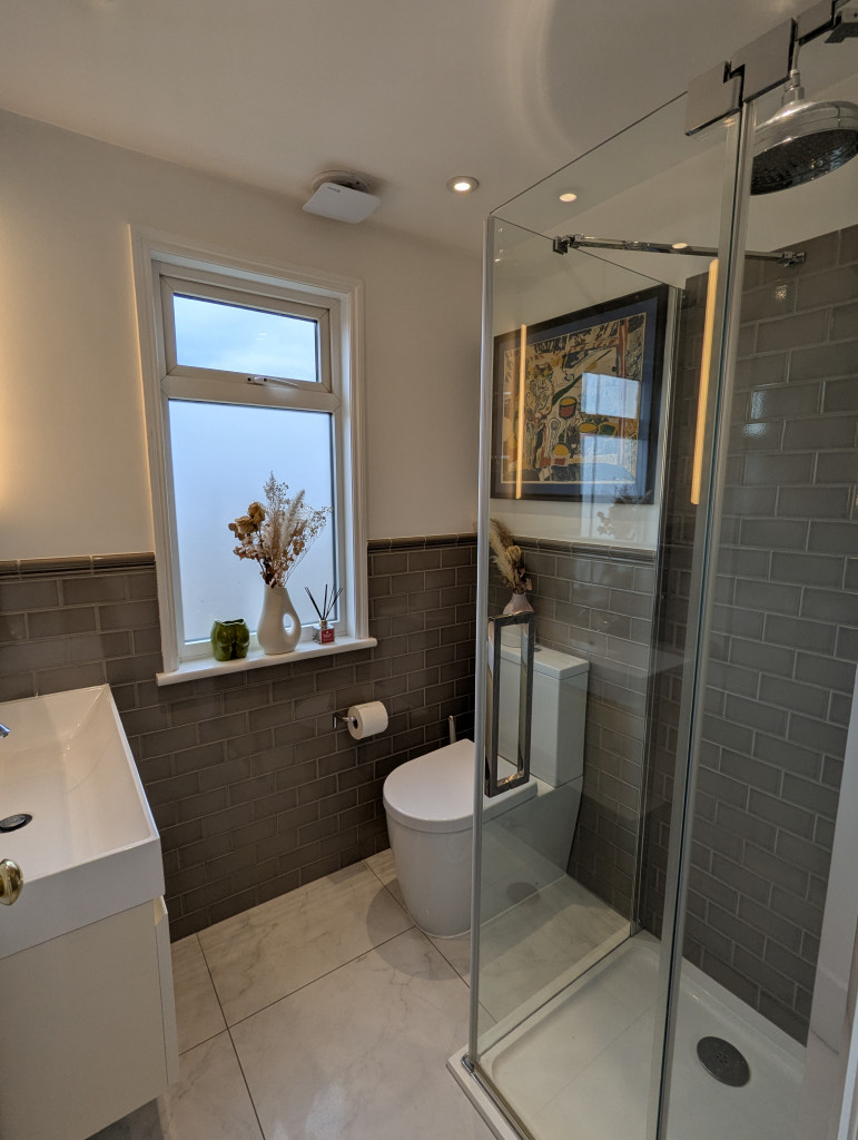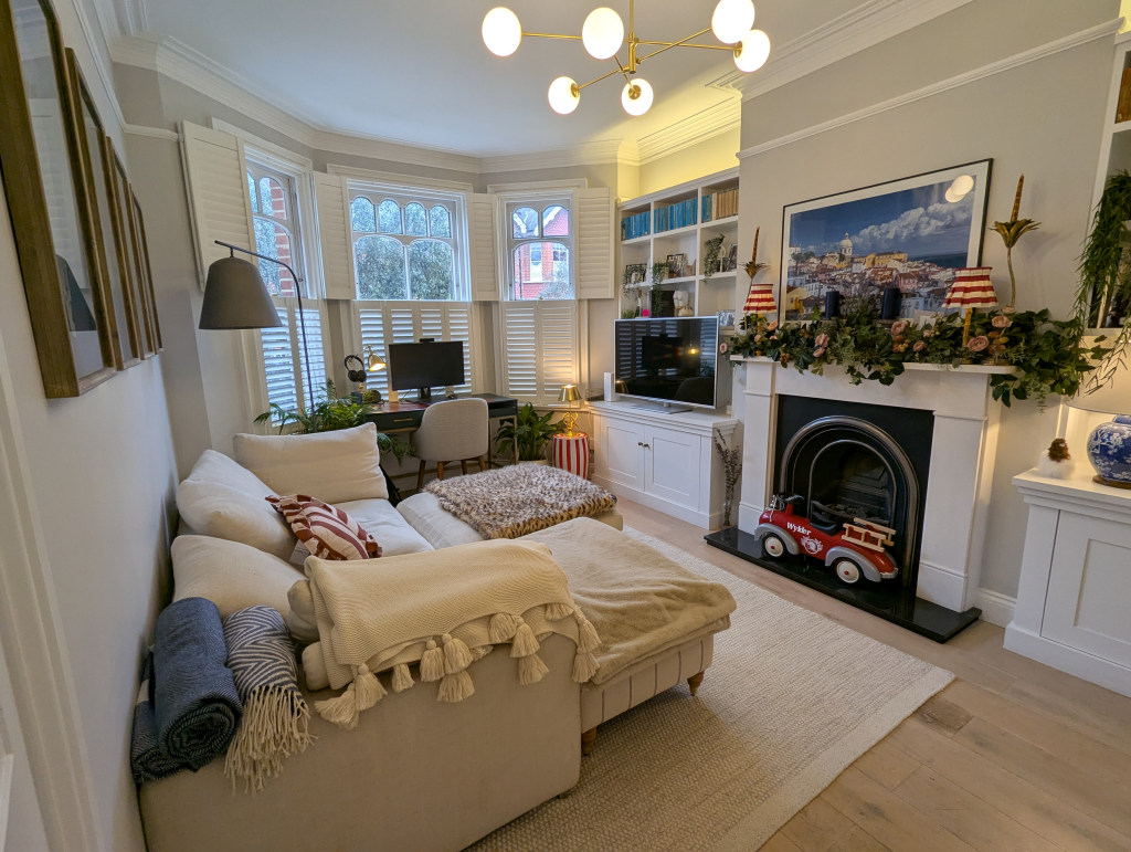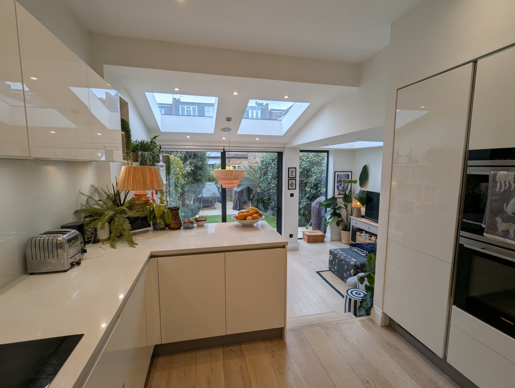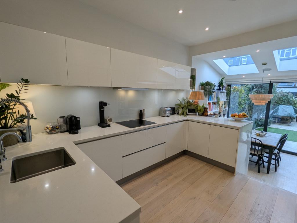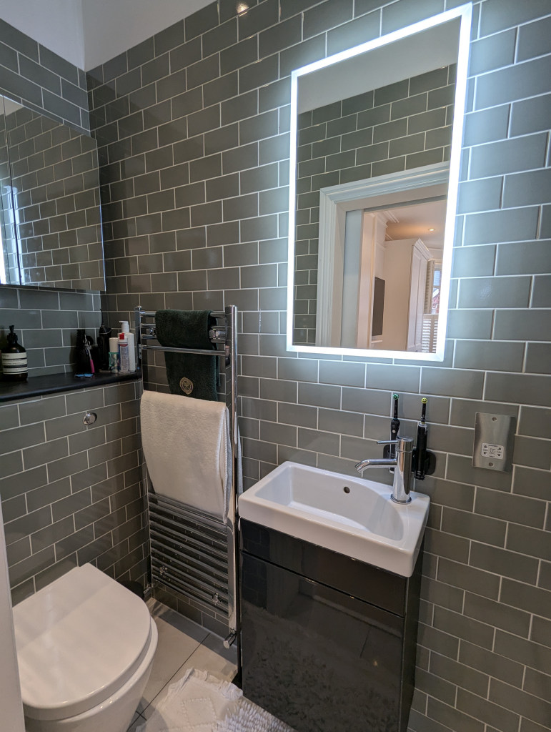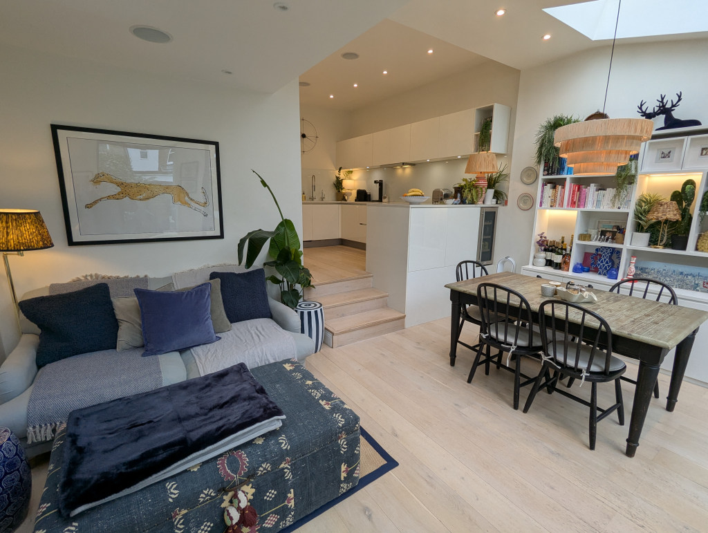 Ground floor: off the hallway is an elegant sitting room with sofa and TV. The rear of the house has been extended to create an open plan kitchen / dining / sitting room. The kitchen has all the expected appliances. The dining table seats 6 people. There is a comfortable sofa to watch the TV. Glass doors open on to the rear garden with a terrace and garden furniture. There is also a guest WC and a laundry room on this floor.