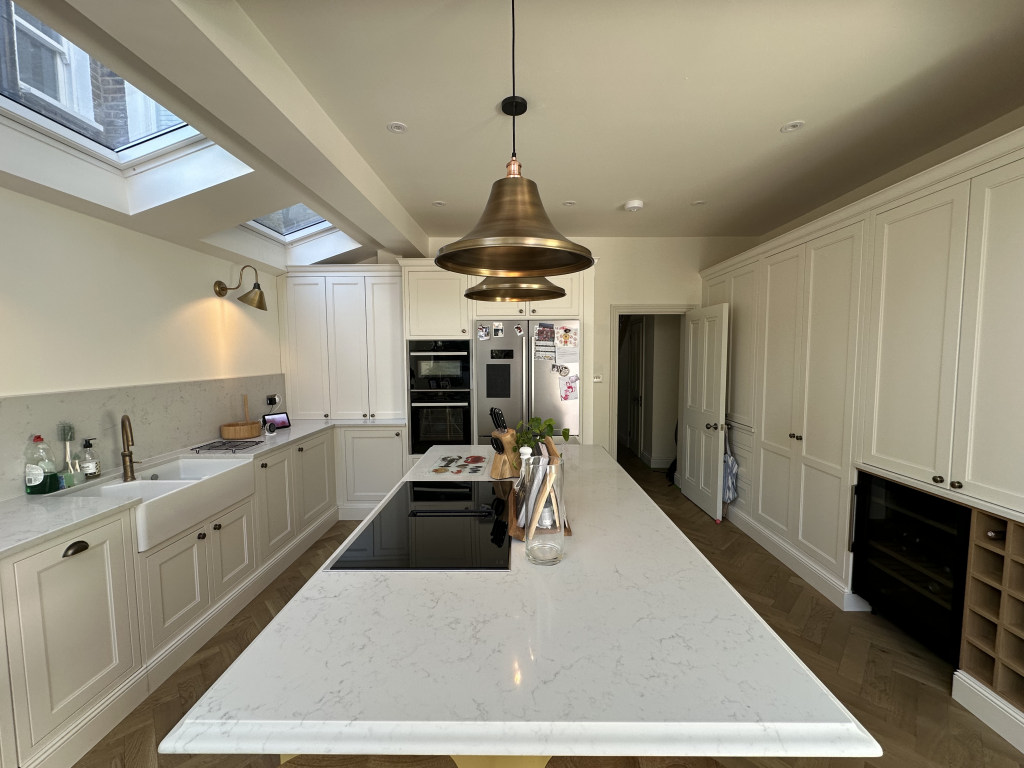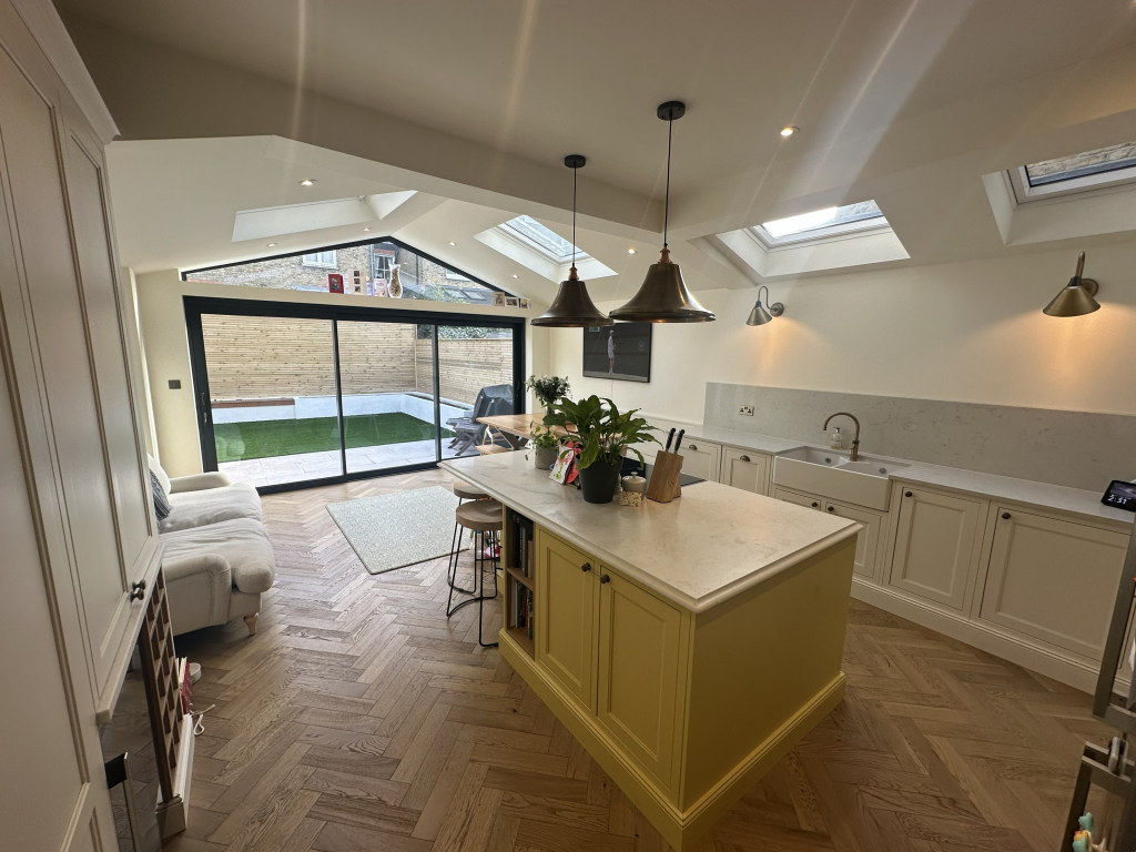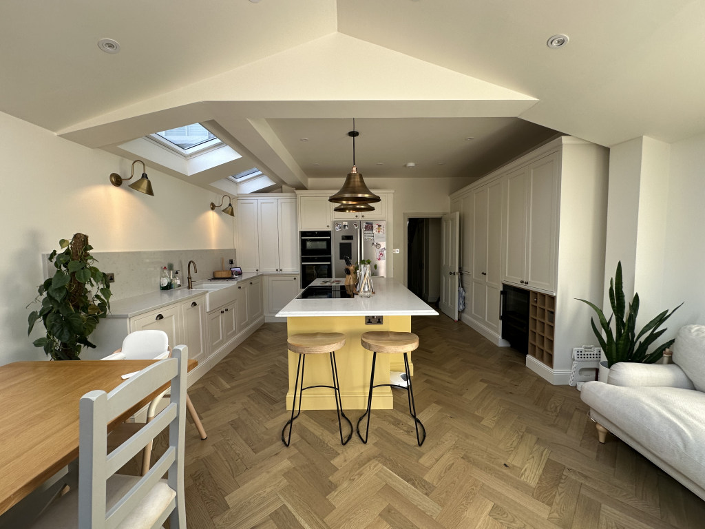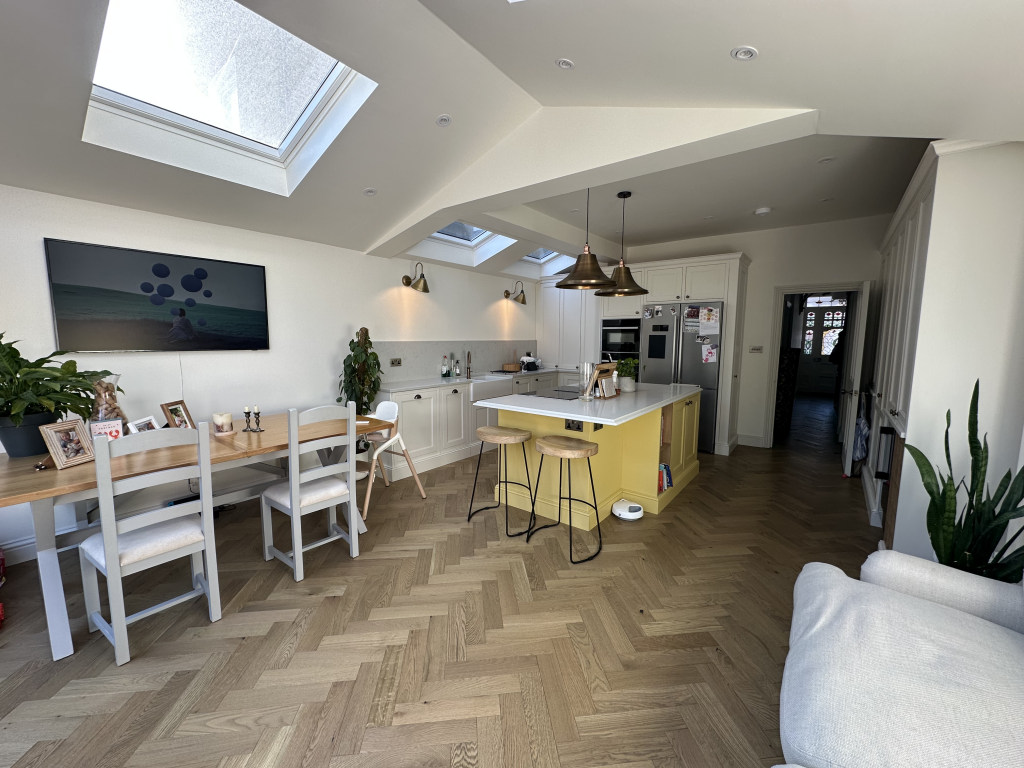 Ground floor: off the hallway is a relaxing sitting room with a sofa and TV (Now, Netflix, Disney, Amazon Prime). At the rear of the house is a newly fitted kitchen with all the expected appliances. The dining table seats 4 people or there are stools at the island. There is a sofa and TV. Glass doors open onto the rear garden. Also on this floor is a utility room and guest WC.