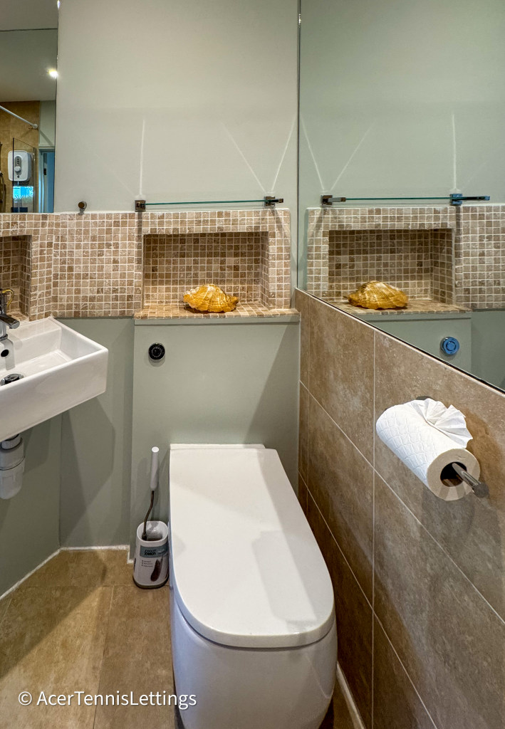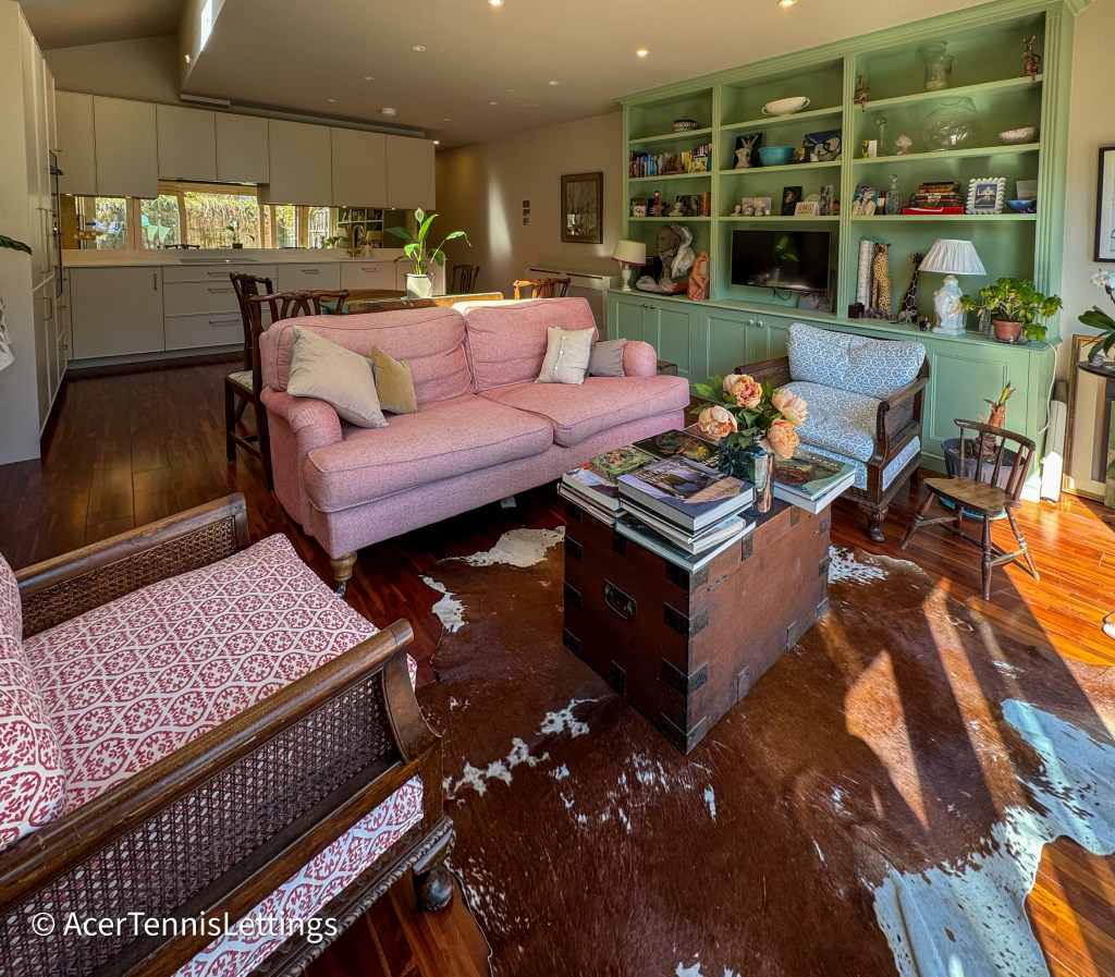 At the rear of the flat is a large open plan kitchen / dining / sitting room. The kitchen is brand new and well appointed with all the expected appliances. There is a table to seat 4 people. The sitting area has a sofa and chairs and a Smart TV. Glass doors open onto the garden with a table and chairs.