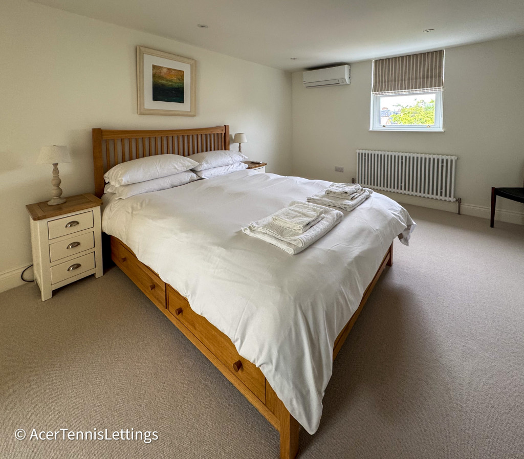 Second floor: Bedrooms 3 and 4 both have air conditioning. Bedroom 3 has a 5ft wide king size bed. Bedroom 4 has a standard size double bed. The separate bathroom has a walk in shower, basin and WC.
