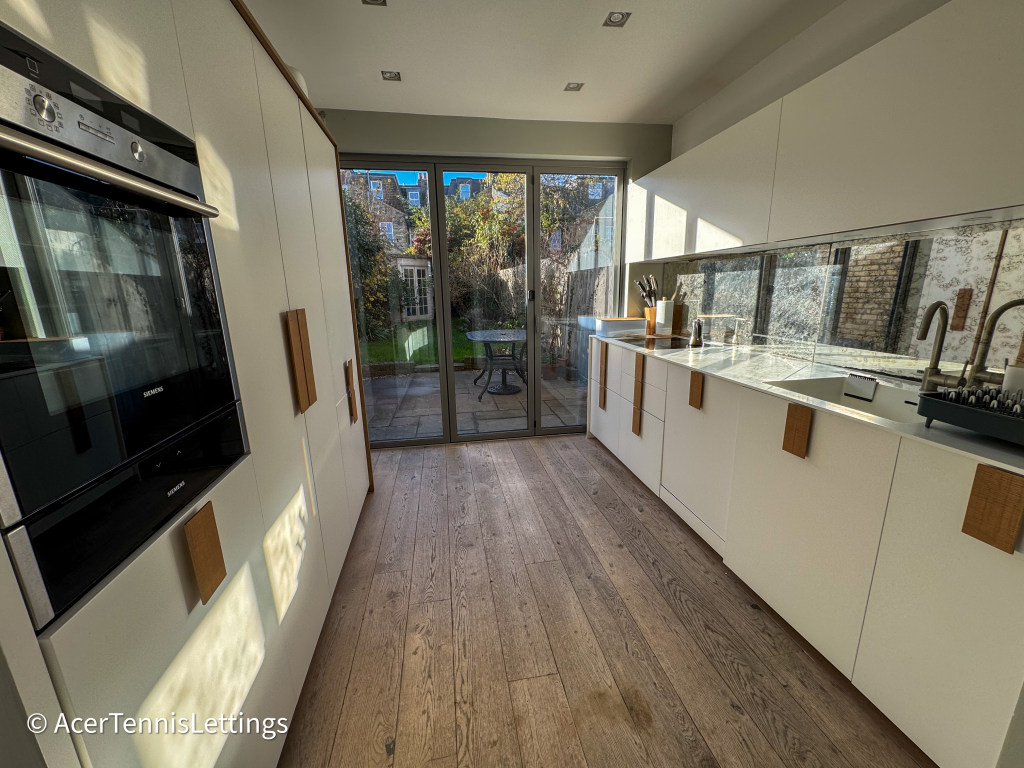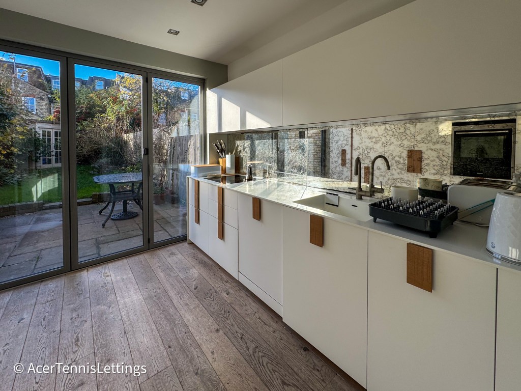 Ground floor: off the hallway is a light and airy double reception room with sofas and a TV to the front, and a dining table and 4 chairs at the rear. The kitchen is modern and well equipped and has glass doors which lead onto the garden. The garden has seating on the terrace and a BBQ.