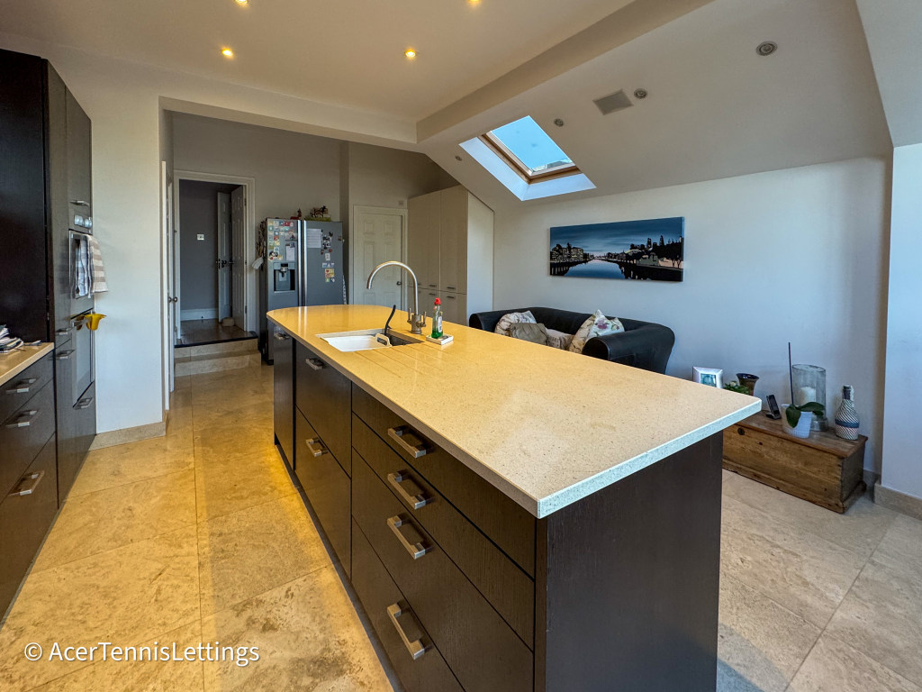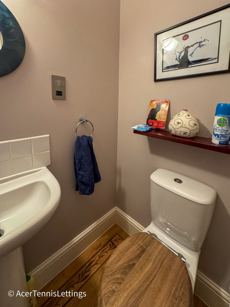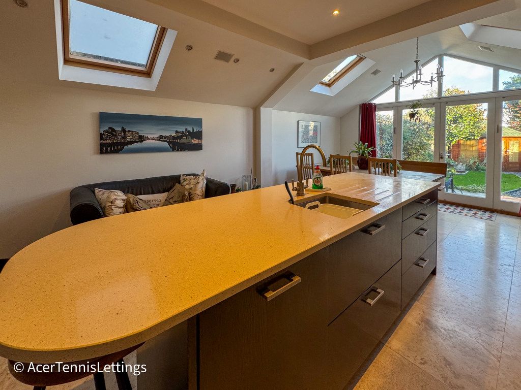 Ground floor: off the hallway is a sitting room with sofas and a TV with Sky, Sky Sports, TNT, Prime, Disney and Paramount. At the rear of the house is an open plan kitchen / diner. The kitchen is well appointed with all the expected appliances. The dining table seats 6 people. There is a separate utility room with the washing machine and drying racks. Glass doors open off the kitchen into the garden with furniture and a BBQ. There is a guest WC off the hallway.
